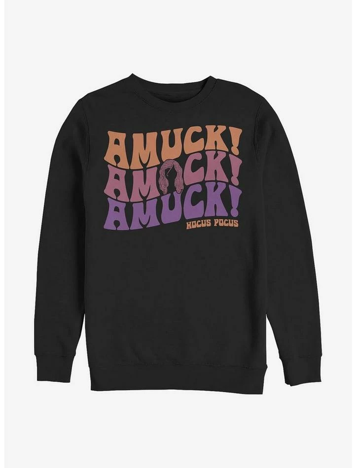 The perfect crew to run amuck! amuck! amuck! in. This black sweatshirt — inspired by Hocus Pocus — features the excitable quote from Sarah Sanderson.
