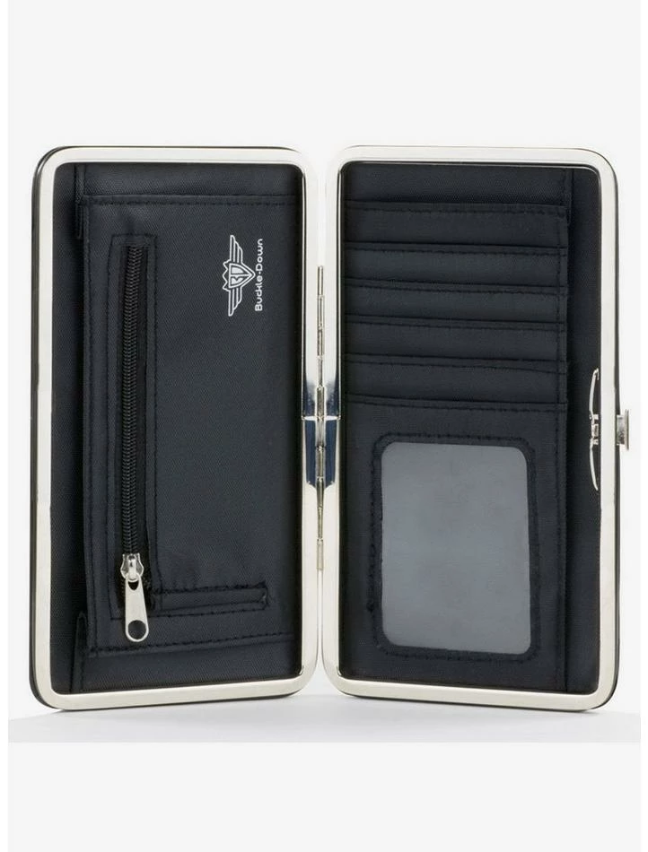 Stylish and sleek, this hinged wallet is made from vegan leather and stainless steel. Features 2 billfolds, 4 card slots, and a windowed ID holder.