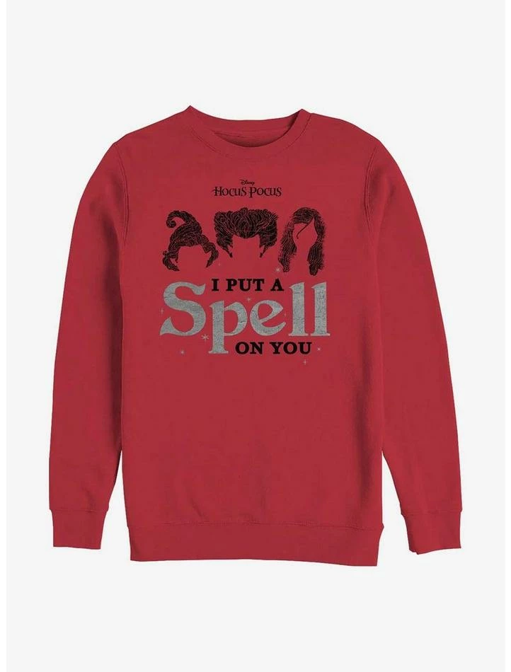 Rep the Sanderson Sisters with this red crewneck that features a Hocus Pocus logo with silhouettes of Mary, Winnie and Sarah — and “I Put A Spell On You” verbiage — below.