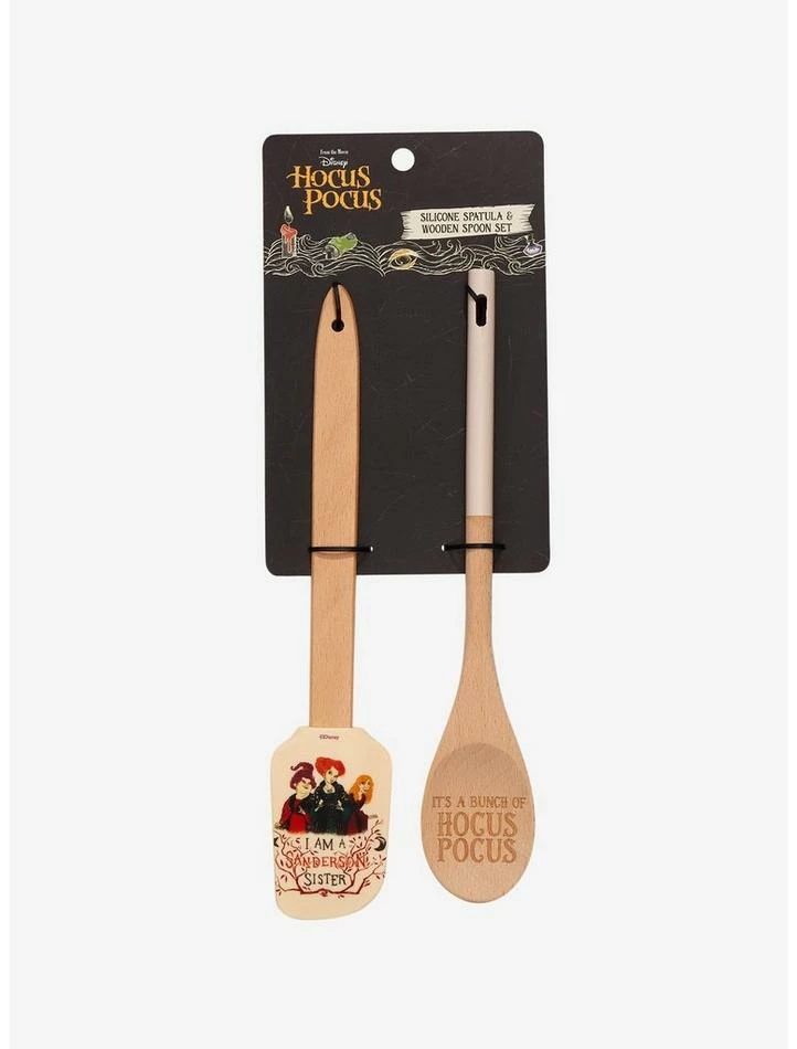 Cooking up a witch’s brew? Stir in a dead man’s toes and get ready to bring your potion to a full boil! This Hocus Pocus spatula and spoon set is essential for mixing in your ghastly potion ingredients! Set includes a spatula with an illustration of the Sanderson Sisters and “I am a Sanderson sister” below, plus a spoon featuring “It’s a bunch of hocus pocus.” Both come with handle notches for easy hanging.