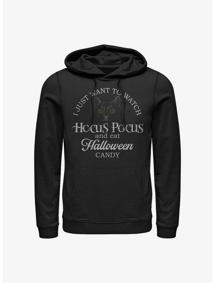 Just want to watch Hocus Pocus and eat Halloween candy? Same! This black pullover hoodie states the obvious around an image of (Thackery) Binx the cat.