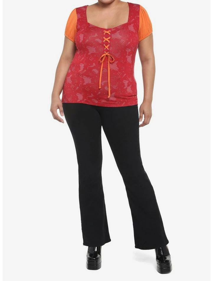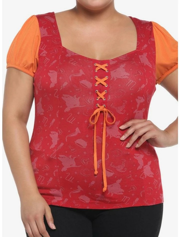 Β Do you smell children or is that just us? Pull on thisΒ Hocus PocusΒ top before taking a ride on your vacuum! This bewitching top is inspired by Mary Sanderson, and features an allover toss of her silhouette and signature vacuum, plus color blocking inspired by her outfit in the film. Complete with a sweetheart neckline, lace-up detailing down the center chest and puff sleeves.